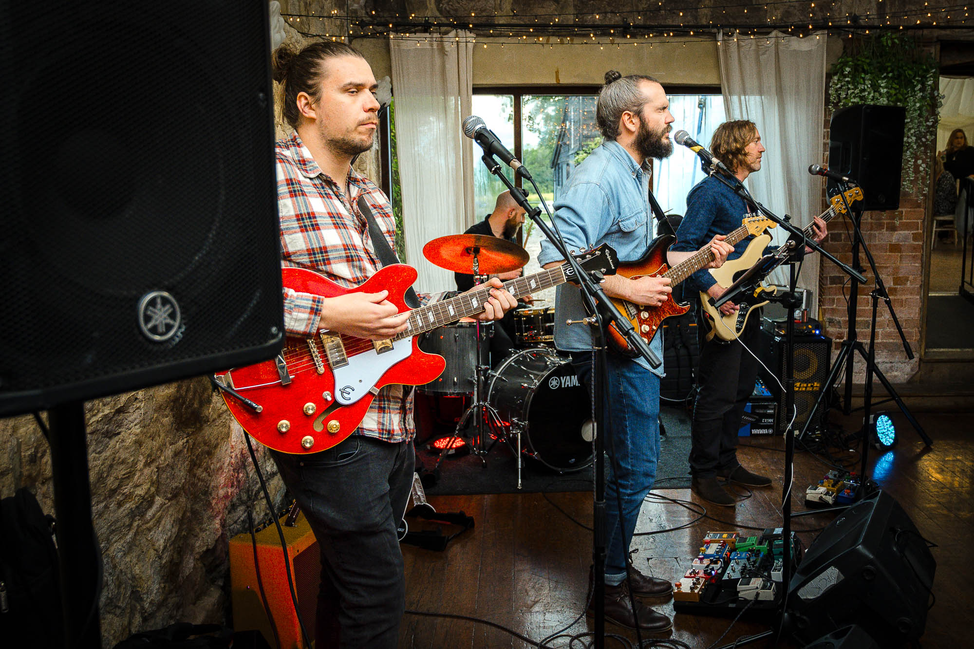 The reception took place inside the beautifully restored barn at Swallows Oast. With its exposed beams, warm lighting and spacious layout, it creates a relaxed yet atmospheric space for dining and dancing.