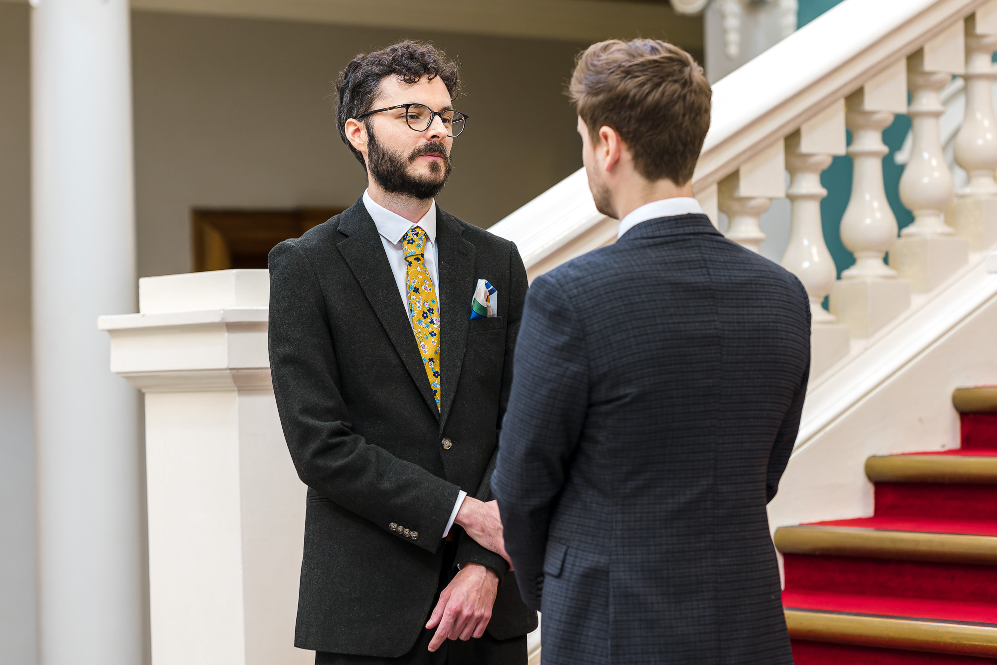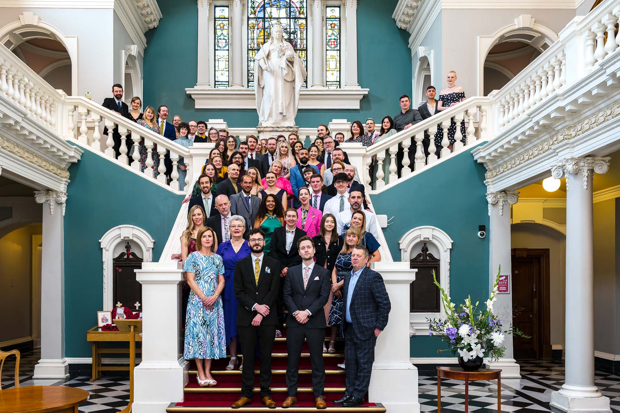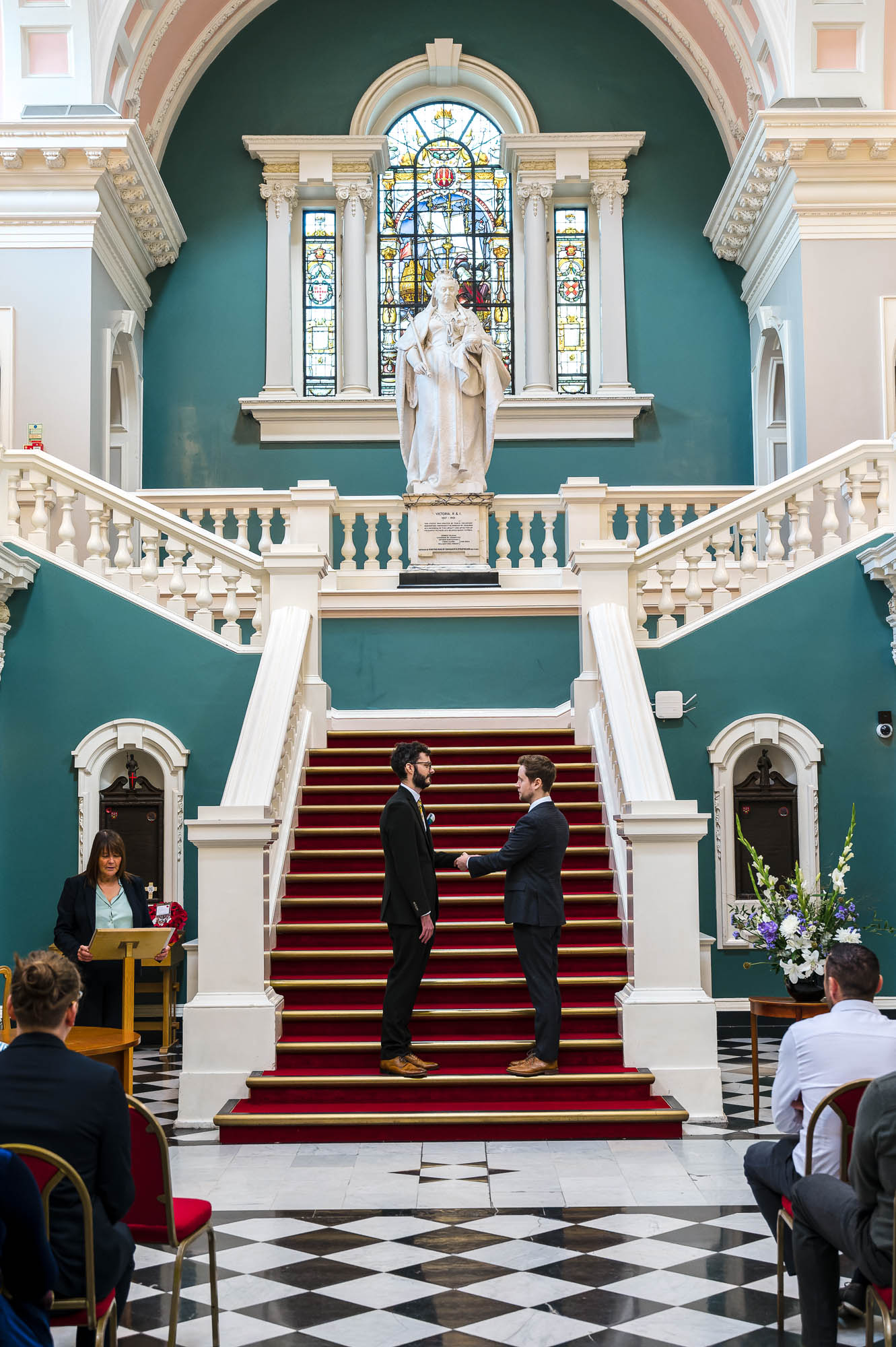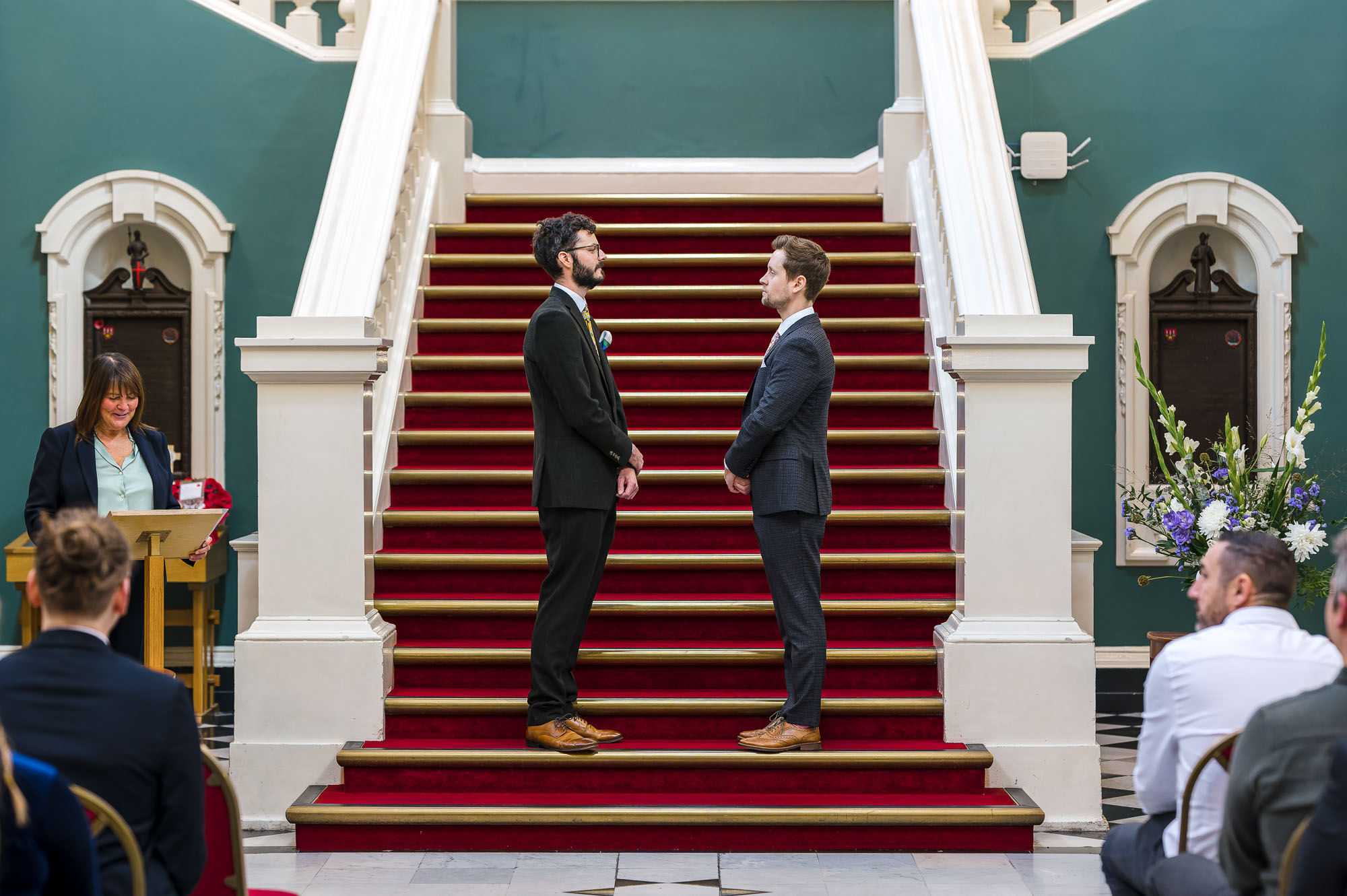 The grooms stood proudly on the sweeping staircase, with their guests seated below in the grand entrance hall. The elevated position created a dramatic and elegant backdrop, adding a sense of occasion to an already emotional ceremony.