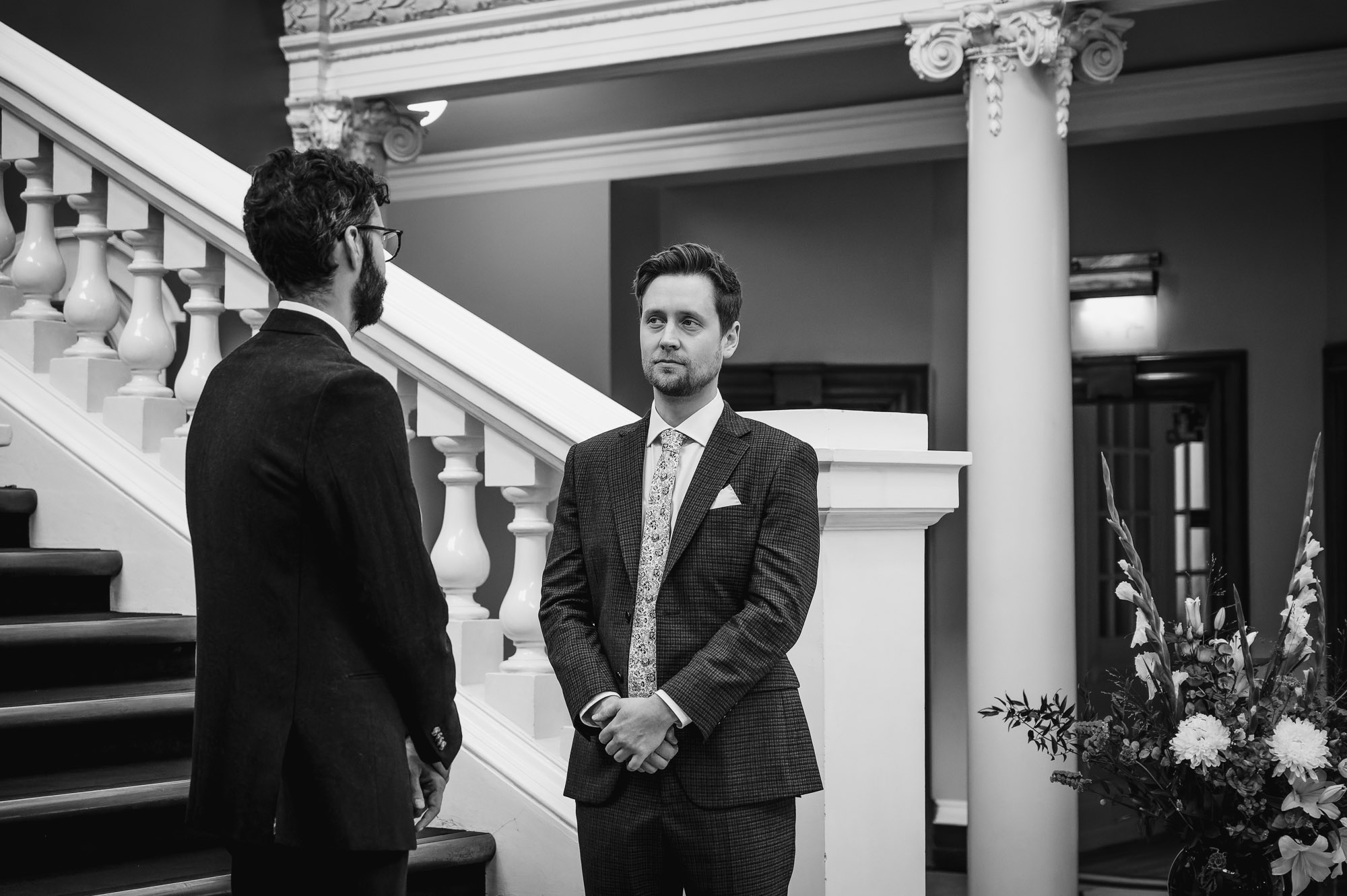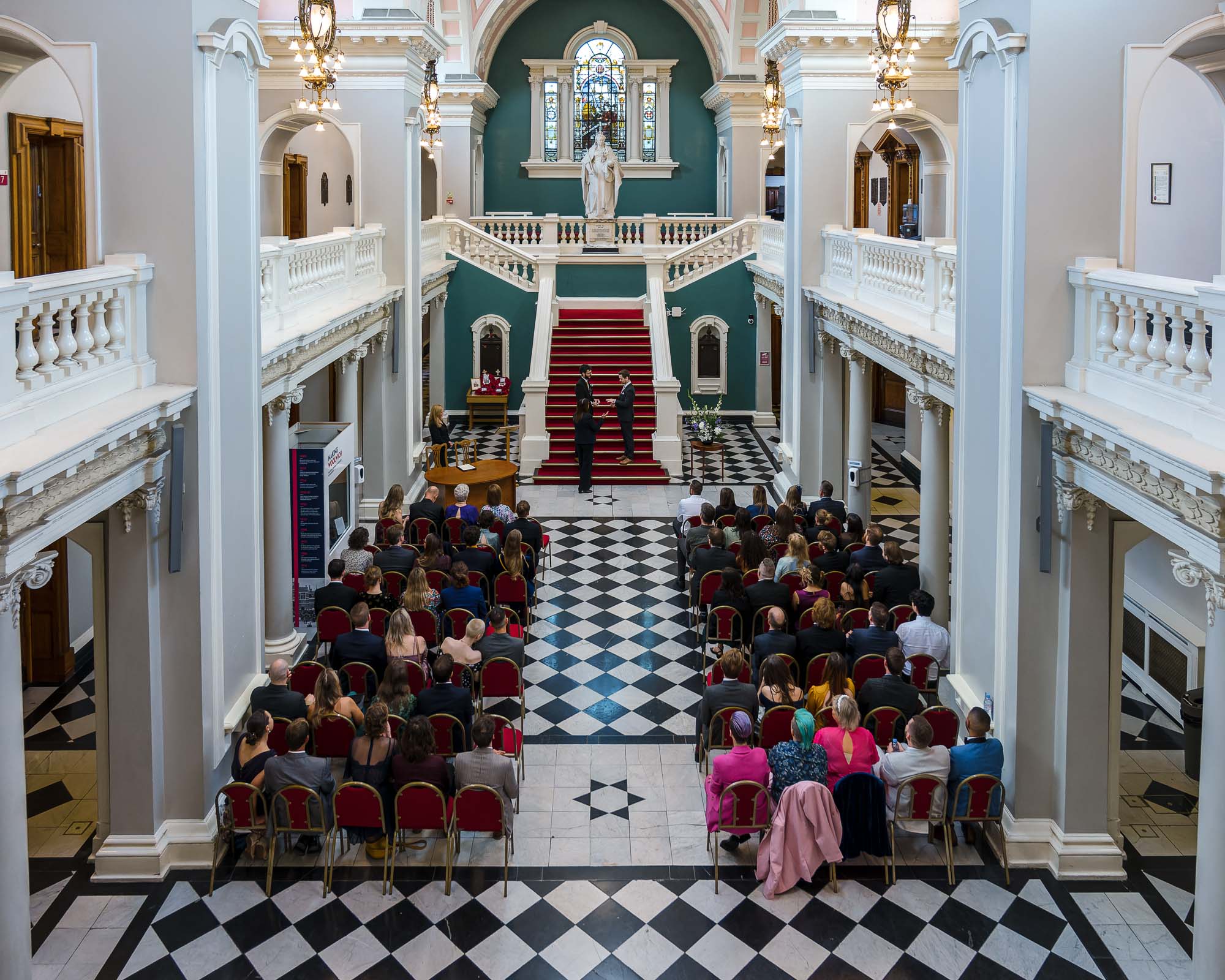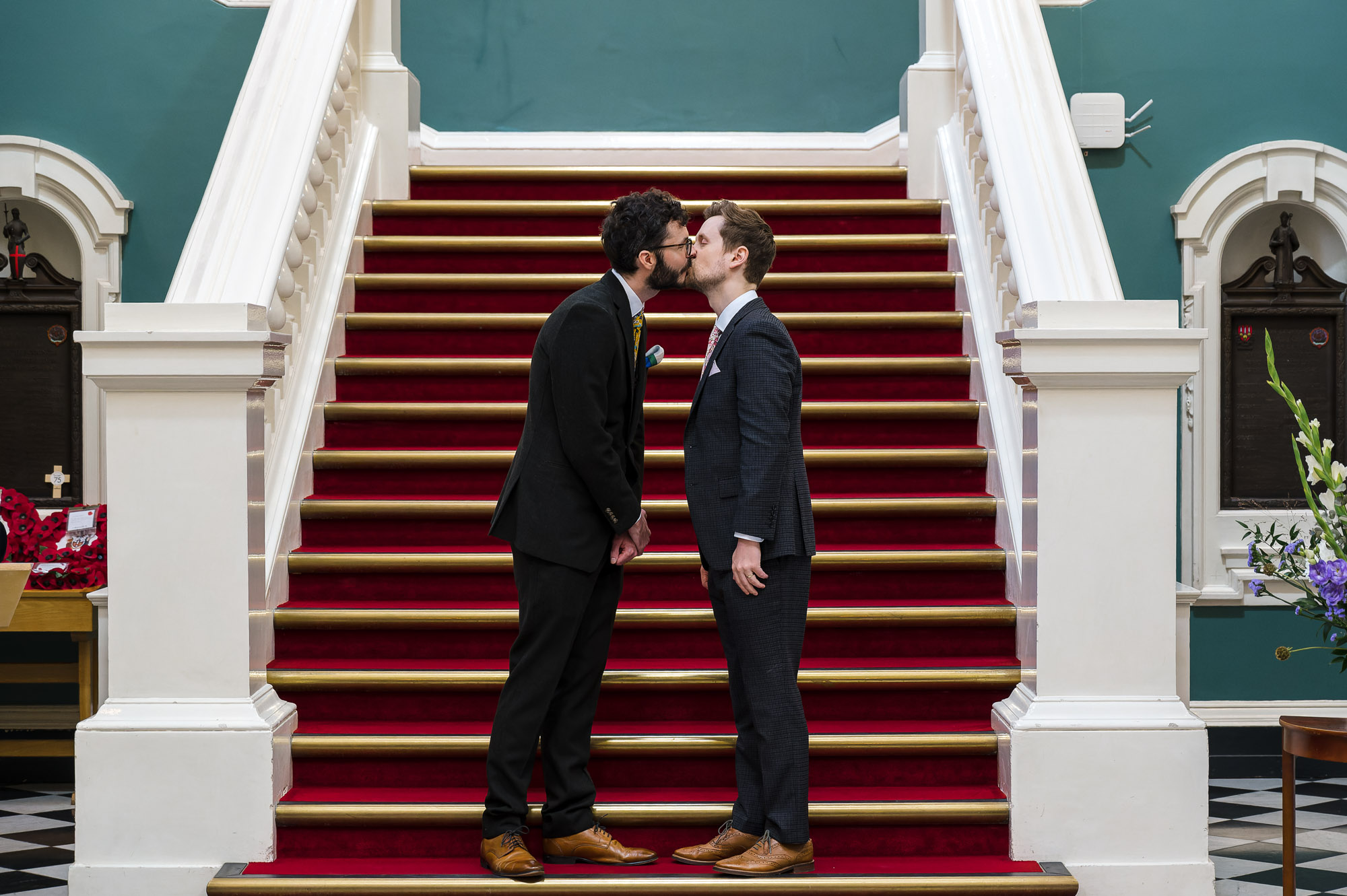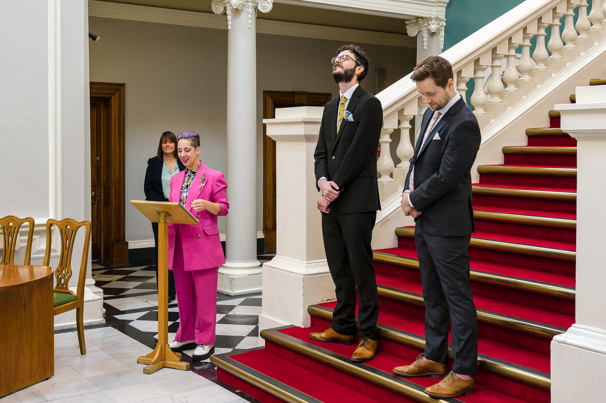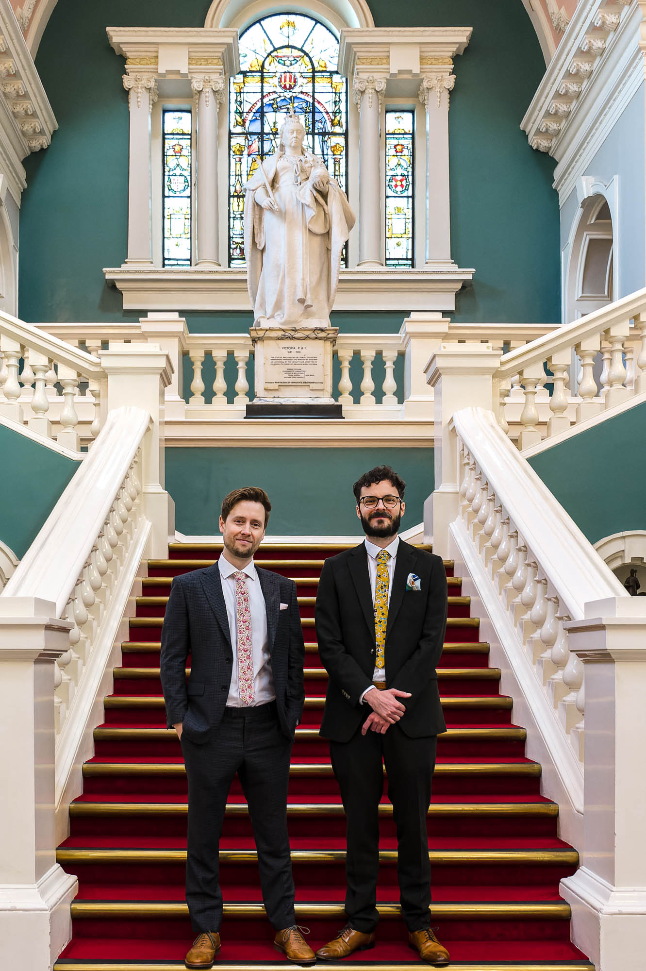 The grooms stood proudly on the sweeping staircase, with their guests seated below in the grand entrance hall. The elevated position created a dramatic and elegant backdrop, adding a sense of occasion to an already emotional ceremony.