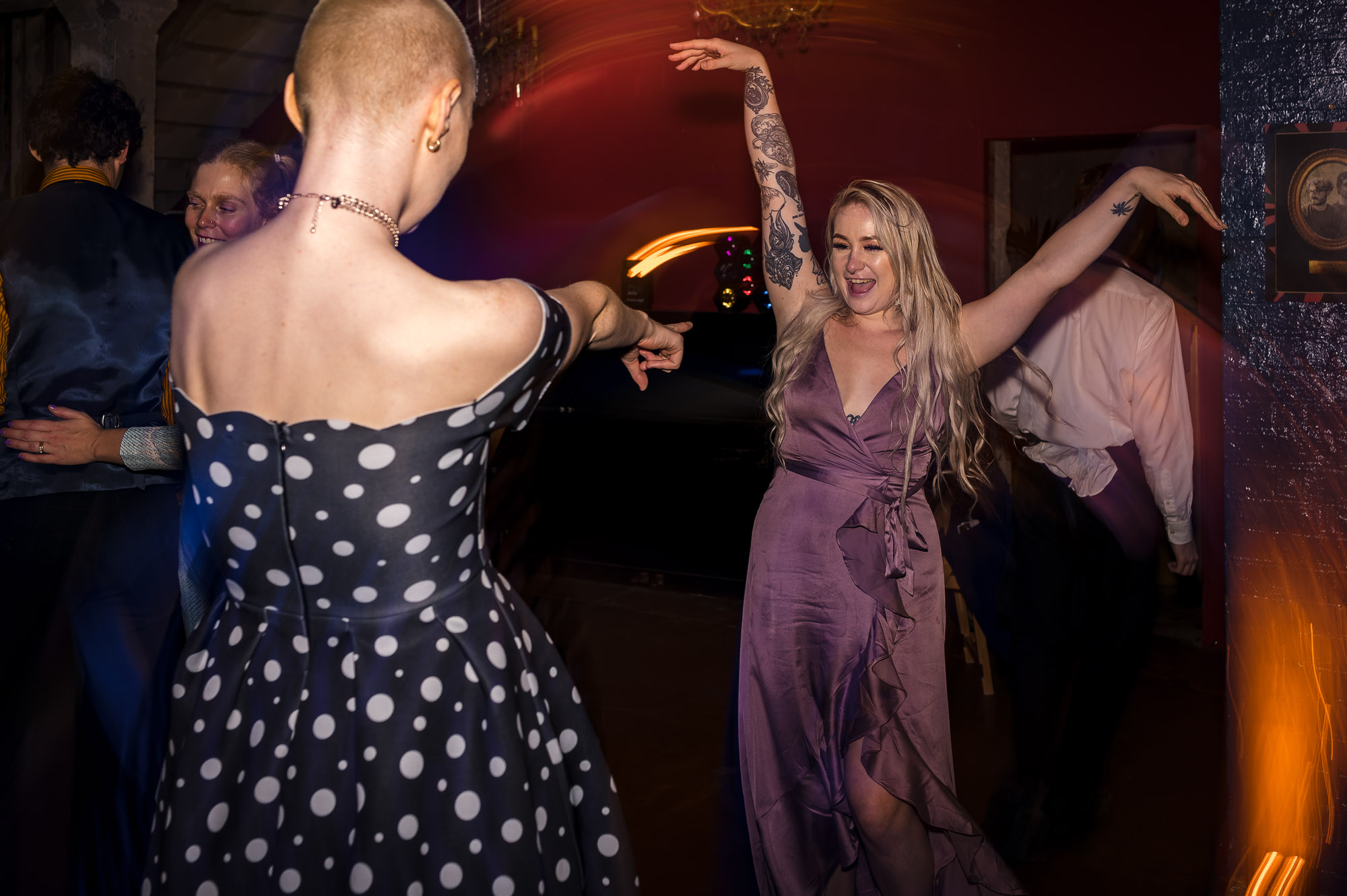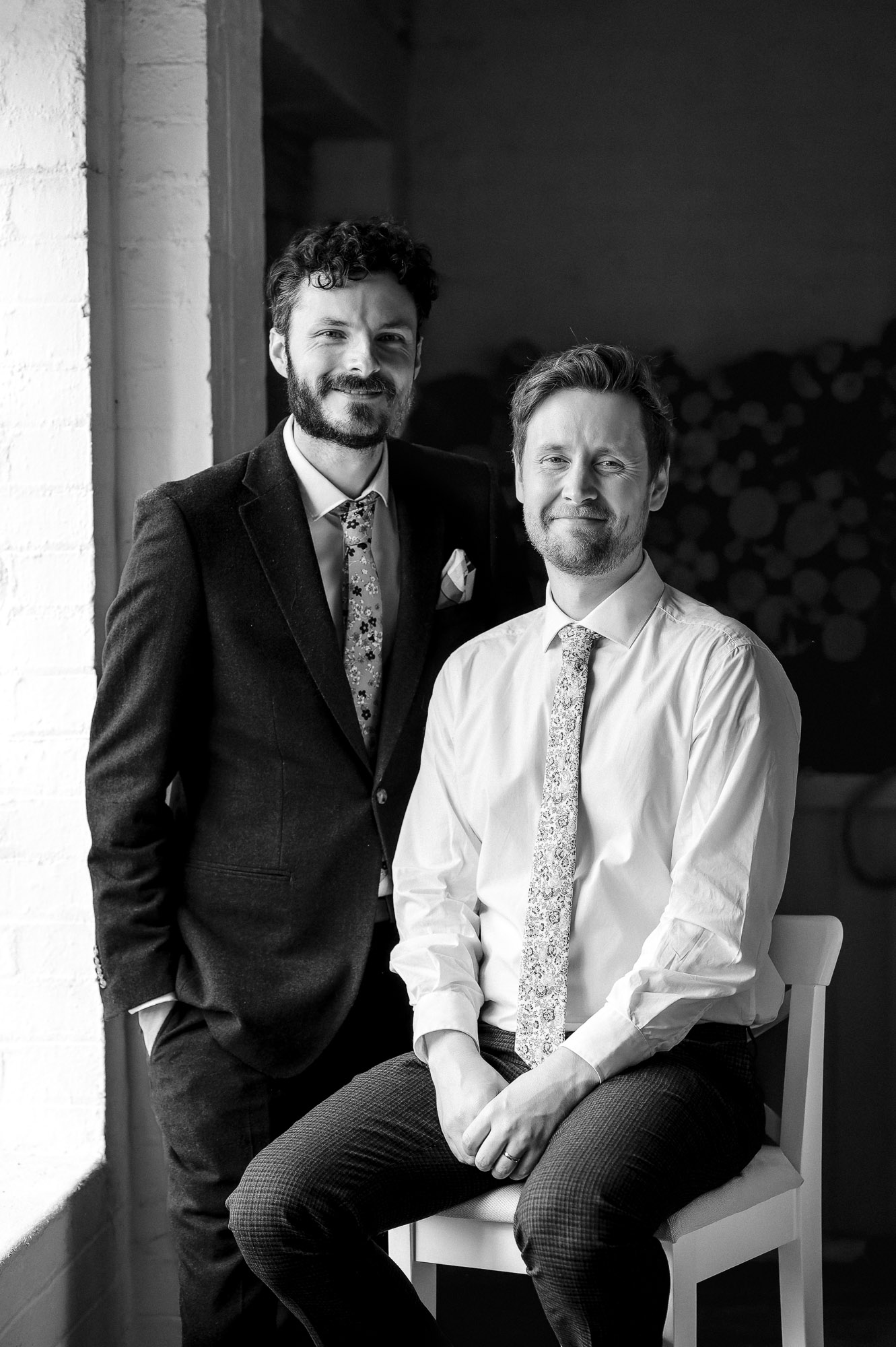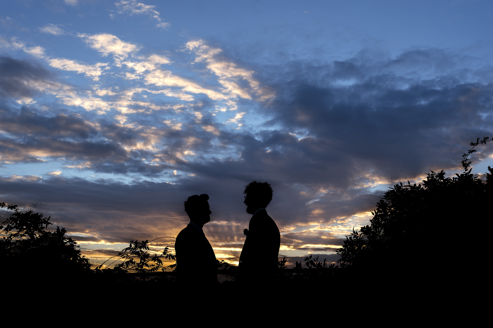 The informal, welcoming atmosphere created wonderful opportunities for documentary-style wedding photography. As the evening drew in, we headed up to the rooftop to capture relaxed sunset portraits of the grooms with their guests — a highlight of the day and a perfect way to mark the transition into the evening celebrations.